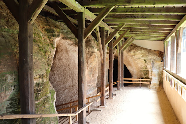 Külastuskeskusest ostsime piletid ja täpselt 12 kogunesime neljakesi saali dokumentaalfilmi vaatama Piusa koobastest ja seal elavatest loomadest. Neljakesi st mina Helmetiga ja kaks vanemat naist Tartust - need kes olid sel hetkel pileti ostnud. Edasi viis giid meid koobastesse. Meile jagati pleedid, sest seal sees on päris jahe. Aga väga mõnus kuumal suvepäeval. Muuseumikoobastesse sisse enam ei pääse nagu vanasti, ainult piirde tagant saad imetleda. Olen ammustel aegadel ka koobastes sees käinud. Nüüd varisemisohu tõttu enam ei lubata.