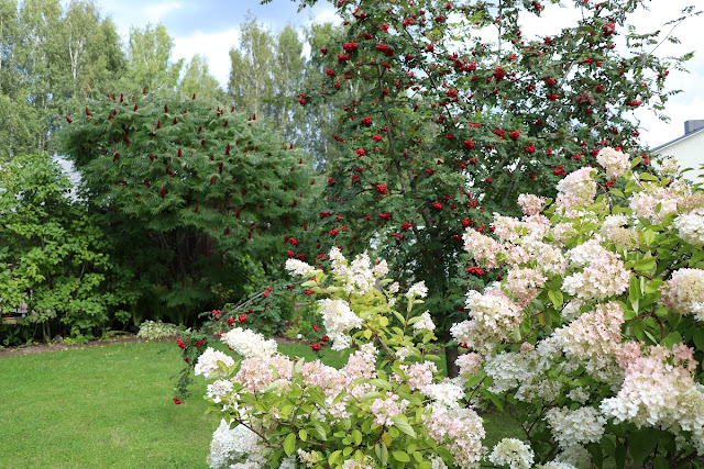 Vaade majaesisele platsile hortensia, kultuurpihlaka ja äädikapuuga.
